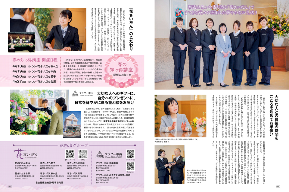 PUBLISH 3月25日発売の「せんだいタウン情報 S-style」4月号にて掲載されます 花さいだんとはどのような葬儀社なのか、代表インタビューも交えご紹介させて頂いております。ぜひご覧ください。 秋の事前相談会 画像はクリックで拡大できます お知らせ シェアしていただけると励みになります