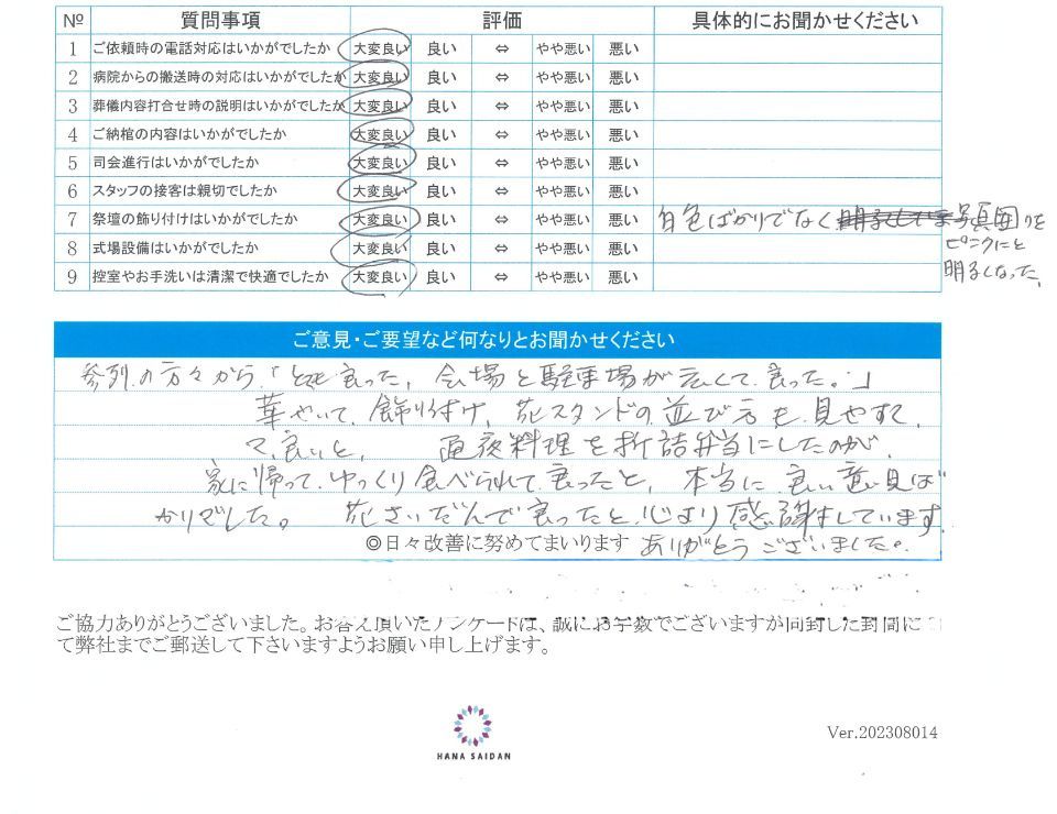 花さいだんで葬儀を行われたご遺族様から、アンケートを通じて温かいお言葉をいただきました。