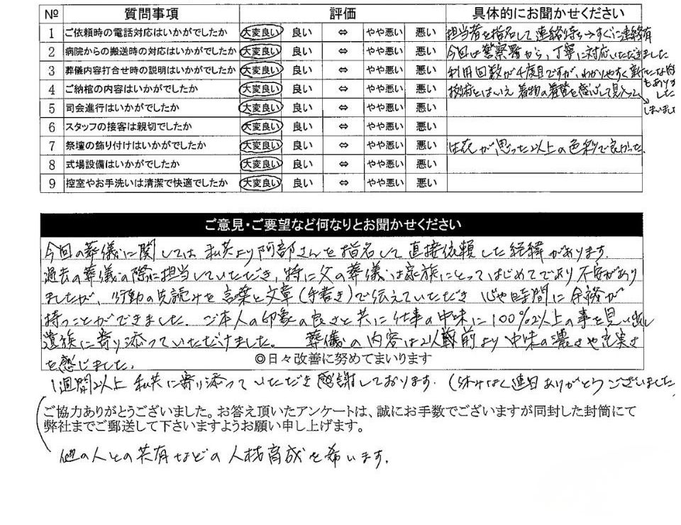 ご本人の印象の良さと共に仕事の中味に100%以上の事を見い出し遺族に寄り添っていただけました。